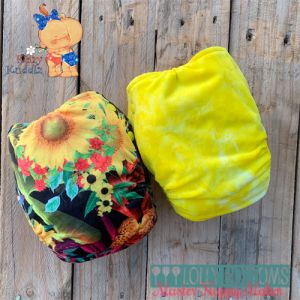 Lined in white microfleece, with a hidden PUL layer so no cover is required. Boosting consists of a microfleece topped trifold plus a super heavyweight mini booster for 8 thirsty layers